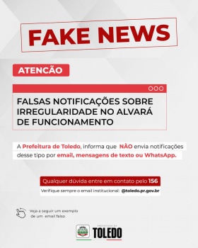 A Prefeitura de Toledo alerta os cidadãos sobre notificações falsas de irregularidades no Alvará que estão sendo enviadas por e-mail para os contribuintes em nome desta prefeitura.