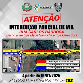 Também haverá um desvio para quem segue na Rua Carlos Barbosa, no sentido Jardim Coopagro em direção à Vila Industrial. O motorista vai precisar entrar na Rua Cerro Corá e seguir até a Avenida Parigot de Souza.
