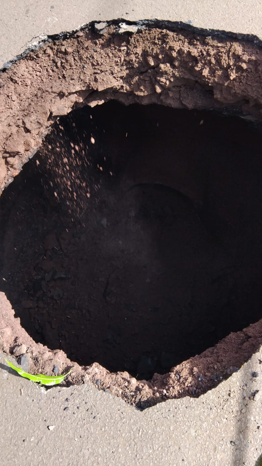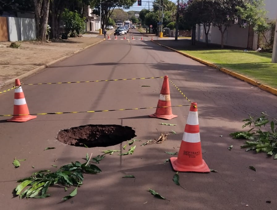 Um buraco se formou nesta quarta-feira (02), no meio da Rua Santo Ângelo, entre as ruas Barão do Rio Branco e Padre Anchieta, na Vila Industrial, em Toledo. O afundamento da pista foi causado pelo rompimento da galeria de águas pluviais em dois pontos, o que representava risco aos motoristas e exigiu a interdição imediata do trecho.