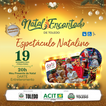 Para tornar o Natal Encantado de Toledo ainda mais especial, a Prefeitura trará uma atração única nesta terça-feira, dia 19 de dezembro: espetáculo natalino Meu Presente de Natal, do grupo Darte Entretenimento.