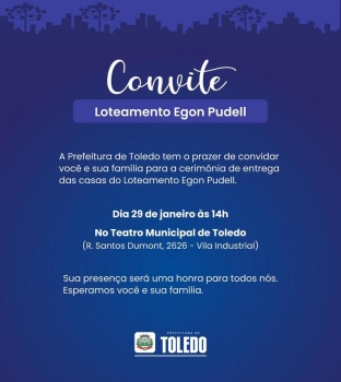 Na quarta-feira (29), a Prefeitura de Toledo, por meio da Secretaria do Planejamento, Habitação e Urbanismo, vai realizar uma cerimônia de entrega de 84 casas da fase 1 do Loteamento Egon Pudell. O evento será realizado no Teatro Municipal e contará com a presença do prefeito Mario Costenaro, do vice-prefeito Lucio De Marchi, do presidente da Câmara Municipal, Gabriel Baierle, do secretário de Planejamento, Ronald Drabik, de representantes da Caixa Econômica Federal e da empresa responsável pelas obras.