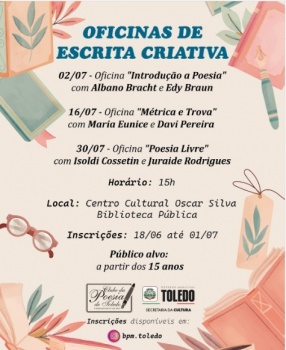 A Biblioteca Pública de Toledo, em colaboração com o Clube da Poesia, convida a comunidade para participar do projeto "Oficinas de Escrita Criativa", uma iniciativa promovida pela Prefeitura de Toledo, através da Secretaria Municipal da Cultura.