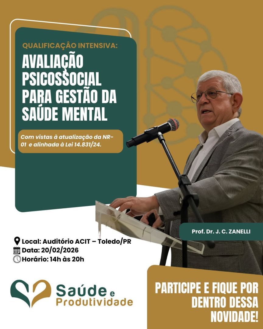 Uma qualificação intensiva voltada à avaliação psicossocial para a gestão da saúde mental será realizada no dia 20 de fevereiro de 2026, no Auditório da Associação Comercial e Empresarial de Toledo (ACIT), em Toledo. O evento ocorre das 14h00 às 20h00 e é promovido pela Saúde e Produtividade, com foco na atualização da Norma Regulamentadora de Nº 01 (NR-01) e alinhamento à Lei Federal de Nº 14.831/2024.