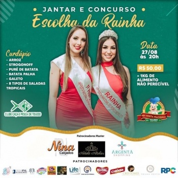 Iniciado em 1988 junto ao Clube Caça e Pesca de Toledo, ocorre neste sábado (27) o tradicional concurso de escolha da Rainha da Festa do Porco no Rolete, que destaca a beleza da mulher toledana e já serviu de trampolim para as escolhidas alçarem voos mais altos com premiações em concursos de Miss Toledo, Miss Paraná e Miss Brasil World.