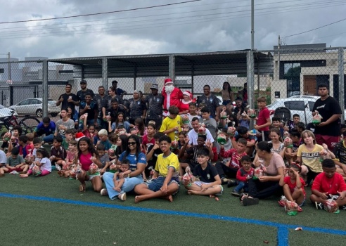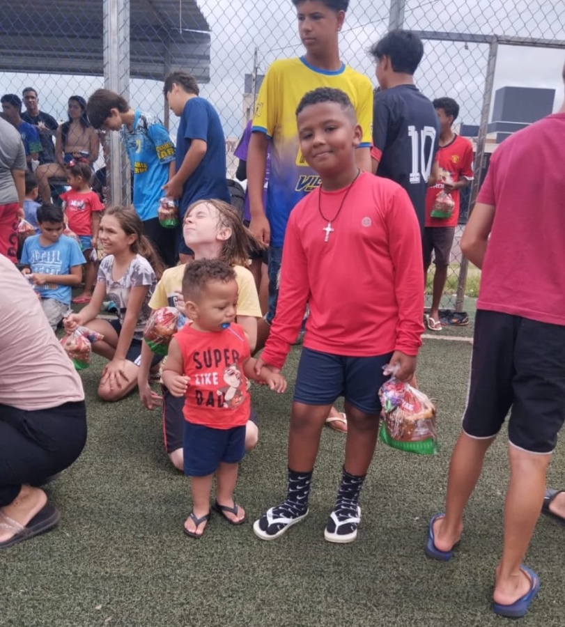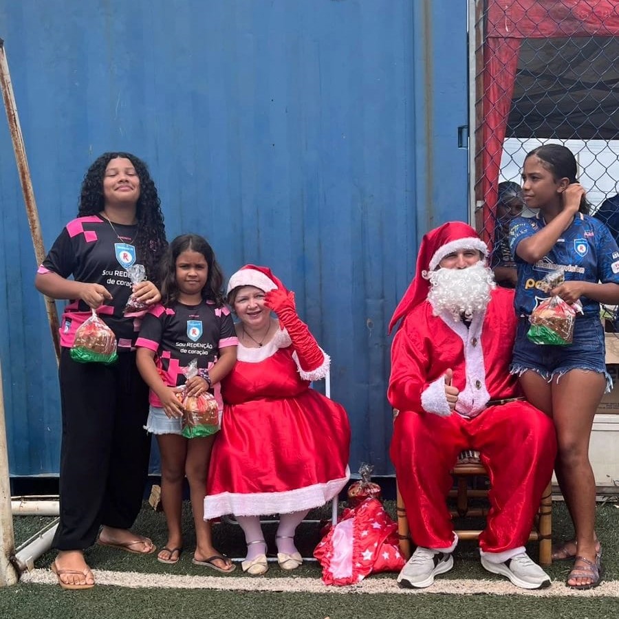 Mais de 100 panetones foram distribuídos às crianças, que também participaram de um café da manhã especial. Os alimentos e presentes foram arrecadados por meio de doações, demonstrando o espírito solidário dos moradores e parceiros do Redenção FC.