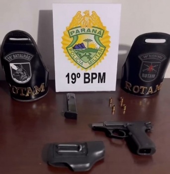 Uma equipe da Rondas Ostensivas Tático Móvel (Rotam) da Polícia Militar (PM) de Toledo efetuou a apreensão de uma arma de fogo e munições na noite de terça-feira, 26, após abordar um condutor com comportamento suspeito na Avenida Parigot de Souza. Os policiais observaram uma Toyota Hilux, de cor prata em alta velocidade, rampando uma lombada na via.