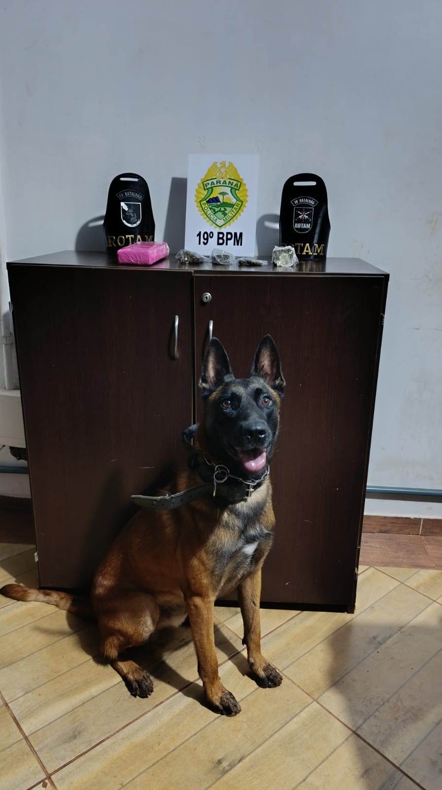 Com a autorização da mãe do menor, a equipe policial, com o auxílio do cão farejador Zeus, localizou um tablete de maconha de 661 gramas, além de outras porções menores da droga, totalizando mais de 700 gramas. Também foram apreendidos uma balança de precisão, embalagens e material para embalar a droga.