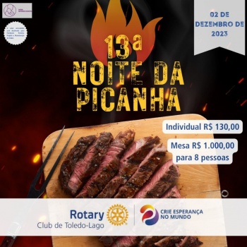 Neste sábado, dia 02 de dezembro, o Rotary Clube de Toledo Lago convida a comunidade para participar da 13ª Noite da Picanha, um evento beneficente que visa arrecadar fundos para os projetos em andamento do Clube, entre eles o Banco de Leite, UTI Neonatal e a Mãe por Amor.