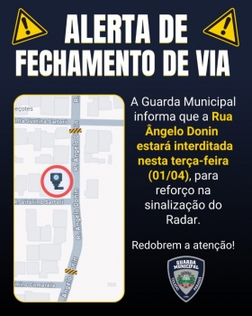 A Guarda Municipal (GM) de Toledo emitiu um comunicado informando que a Rua Ângelo Donin entre as ruas Santa Justina Sartori e Adelmiro Comarella estará interditada nesta terça-feira, dia 01º de abril, ao longo do dia, para a realização de reforço na sinalização do radar instalado na via.