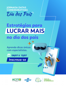 O Sebrae Paraná, através do Ponto de Atendimento (PA) da Associação Comercial e Empresarial de Toledo (ACIT), está promovendo uma iniciativa para comerciantes interessados em impulsionar suas vendas no Dia dos Pais. A Jornada de Datas Comemorativas gratuita oferecerá de 8 a 12 de julho uma semana intensiva de aprendizado com estratégias para lucrar mais no período, diretamente pelo WhatsApp, com encontros online e ao vivo.