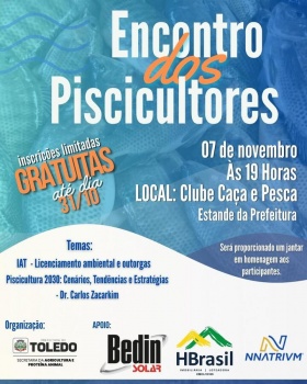 O Clube Caça e Pesca de Toledo será palco do evento “Prosa no Agro - Encontro dos Piscicultores”, um encontro que visa promover a integração entre os piscicultores, fortalecendo a atividade aquícola por meio da união e da cooperação entre os produtores. O evento será realizado na sexta-feira (7) às 19h no estande da Prefeitura de Toledo e conta com inscrições gratuitas até terça-feira (4).