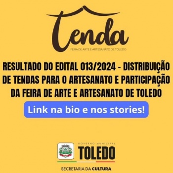 A Secretaria de Cultura de Toledo anunciou nesta semana o resultado do Edital de Nº 013/2024, que trata da distribuição de tendas para profissionais das artes e do artesanato do município. O edital também habilita os contemplados para participarem das Feiras de Arte e Artesanato do Grupo Tenda, promovidas na cidade.