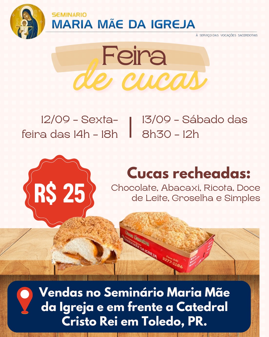 O Seminário Diocesano Maria Mãe da Igreja realiza, nos dias 12 e 13 de setembro, a tradicional Feira de Cucas em Toledo. O evento tem como objetivo arrecadar recursos para a manutenção do seminário, espaço que acolhe e forma seminaristas da Diocese.