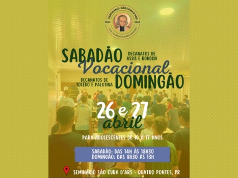 Neste final de semana 26 e 27 de abril o Seminário Menor São Cura d’Ars e a Pastoral Vocacional promovem encontro vocacional “Sabadão e Domingão Vocacional”. No sábado (26), o evento é voltado para as paróquias que compõem o Decanato Assis e o Decanato Rondon, com acolhida às 14h00 e término às 18h30.