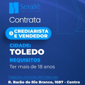 A Serallê Calçados de Toledo está contratando para as funções de Crediarista e Vendedor.