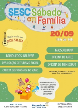O Serviço Social do Comércio (Sesc) - Toledo realiza neste sábado (20) a 7ª Etapa do projeto Sábado em Família / Sesc Lazer, das 15h00 às 19h00, oferecendo uma programação gratuita para toda a comunidade.