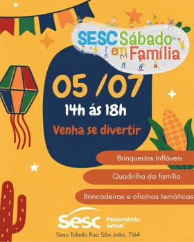 O Serviço Social do Comércio (Sesc) - Toledo realiza neste sábado (05), a 4ª etapa do projeto “Sábado em Família / Sesc Lazer”. O evento ocorre das 14h00 às 18h00 na unidade localizada na Rua São João, Nº 7.164, e contará com uma programação gratuita, aberta à comunidade.