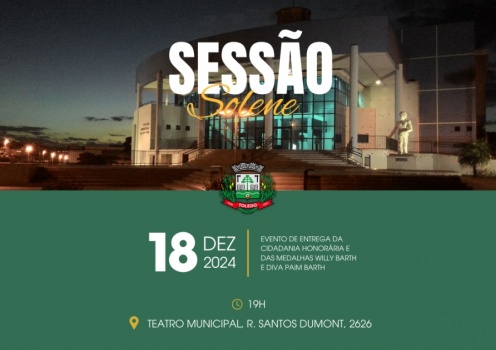 A Câmara de Vereadores convida a comunidade para a Sessão Solene de Concessão e Outorga de Honrarias. Aberto ao público, o evento será realizado no Teatro Municipal, no dia 18 de dezembro (quarta-feira), às 19h00.