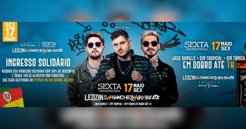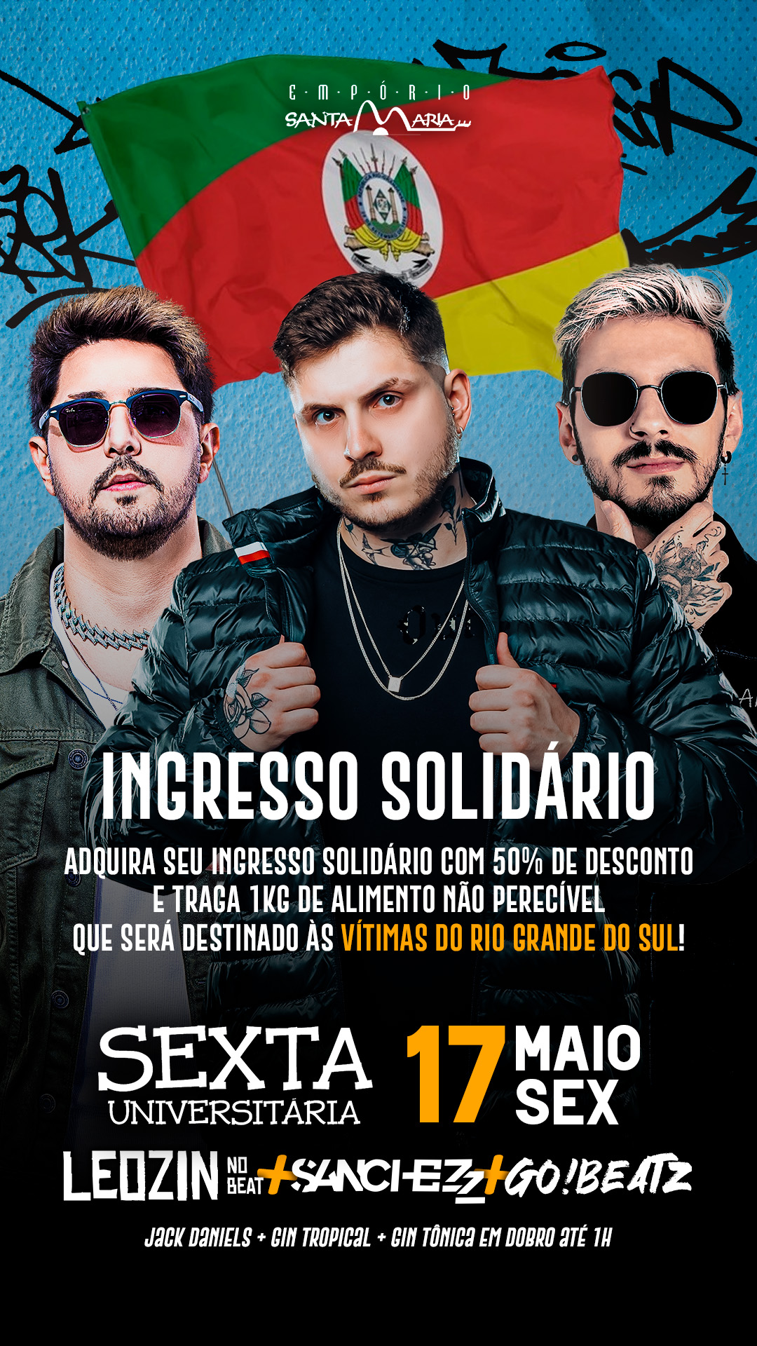 Prepare-se para muita diversão na próxima Sexta Universitária do Empório Santa Maria! No dia 17 de Maio, a partir das 22h00, o Empório traz uma noite imperdível com Sanchez DJ, Leozin no Beat e DJ GoBeatz, garantindo os melhores sons do Funk e Mega Funk para animar a sua noite. E as surpresas não param por aí! Com Jack Daniels, Gin Tropical e Gin Tônica em dobro até 01h00, a festa promete!