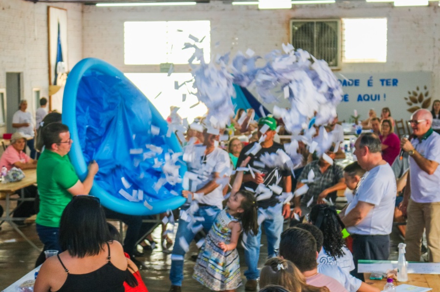 Centenas de pessoas acompanharam o sorteio dos prêmios, que foi realizado no Salão Paroquial da Igreja, logo após o almoço. A animação tomou conta do ambiente a cada número sorteado, e a expectativa crescia a cada prêmio anunciado.
