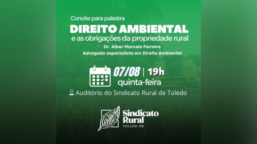 No dia 7 de agosto, quinta-feira, o Sindicato Rural de Toledo receberá o advogado especialista em Direito Ambiental, Alber Marcelo Ferreira. Ele conduzirá uma palestra com temas ligados à regularização de imóveis rurais perante a legislação ambiental. Com início às 19h00, o evento abordará temas cruciais para produtores rurais, como o Cadastro Ambiental Rural (CAR), a ratificação de imóveis em faixa de fronteira e o georreferenciamento.