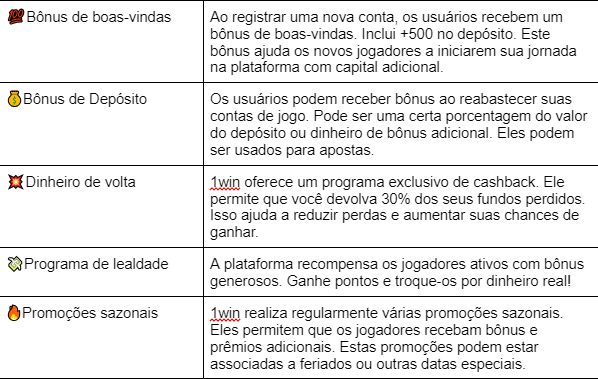 1win agrada seus clientes com uma variedade de bônus e promoções. Eles tornam o jogo ainda mais atraente. Aqui estão alguns dos principais bônus: