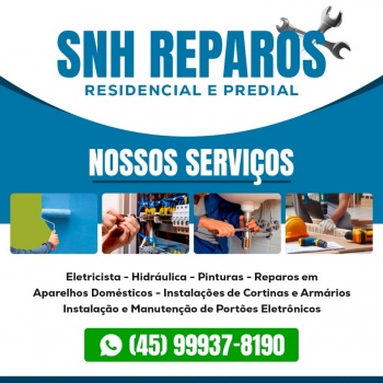 A SNH Reparos, localizada em Toledo, é especializada em serviços residenciais e prediais, oferecendo soluções práticas, rápidas e eficientes para o seu dia a dia. Com uma equipe capacitada e atendimento personalizado, a empresa garante qualidade e confiança em cada serviço prestado.