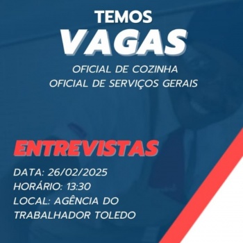 As entrevistas serão realizadas no dia 26 de fevereiro, quarta-feira, às 13h30, na Agência do Trabalhador de Toledo (Sine). Os interessados devem comparecer ao local no horário indicado, levando um documento com foto.