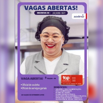 Sodexo de Toledo está com vagas abertas para os cargos de Oficial de Cozinha e Oficial de Serviços Gerais! Candidate-se aqui