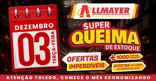 Prepare-se para um dia de grandes economias! Nesta terça-feira, 03 de dezembro, o Allmayer Supermercados terá a sua Super Queima de Estoque! As três lojas em Toledo estarão recheadas com ofertas imperdíveis, oferecendo mais de 1.000 produtos em promoção por todos os setores.