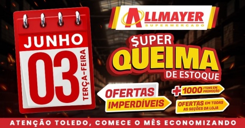Prepare-se para um dia de grandes economias! Nesta terça-feira, dia 03 de junho, o Allmayer Supermercados promove a sua Super Queima de Estoque, oferecendo ofertas imperdíveis em suas três lojas em Toledo. São mais de 1.000 produtos em promoção em todos os setores, com descontos incríveis em frutas, verduras, carnes, laticínios e muito mais.