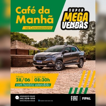 Neste sábado, dia 28 de junho, a Fipal Fiat de Toledo preparou um dia especial para você. A partir das 08h30, será servido café da manhã para receber os clientes com conforto e atenção. Essa é a oportunidade perfeita para conhecer as melhores ofertas e sair de carro novo.