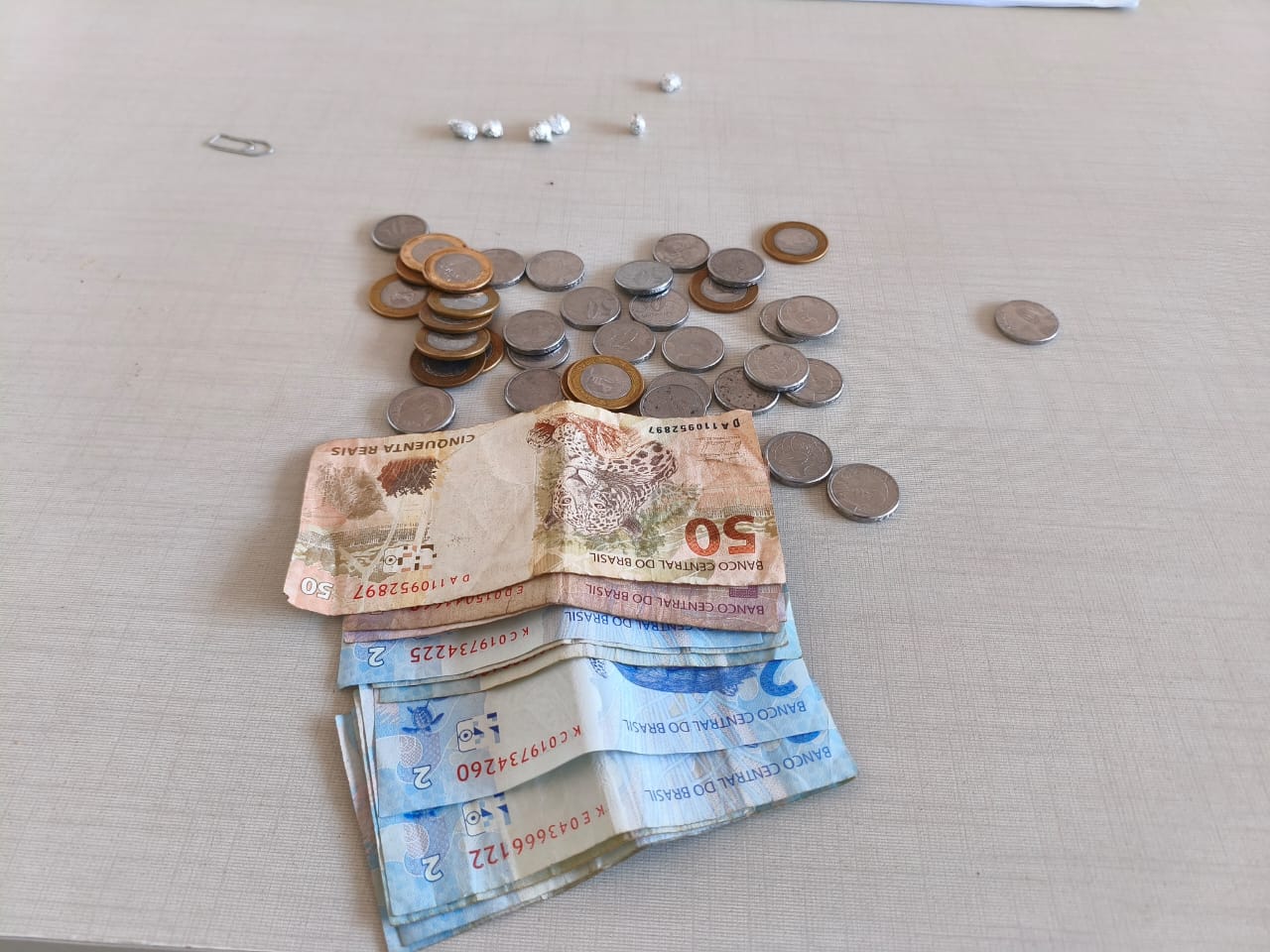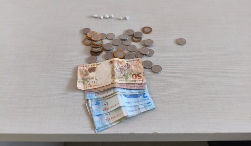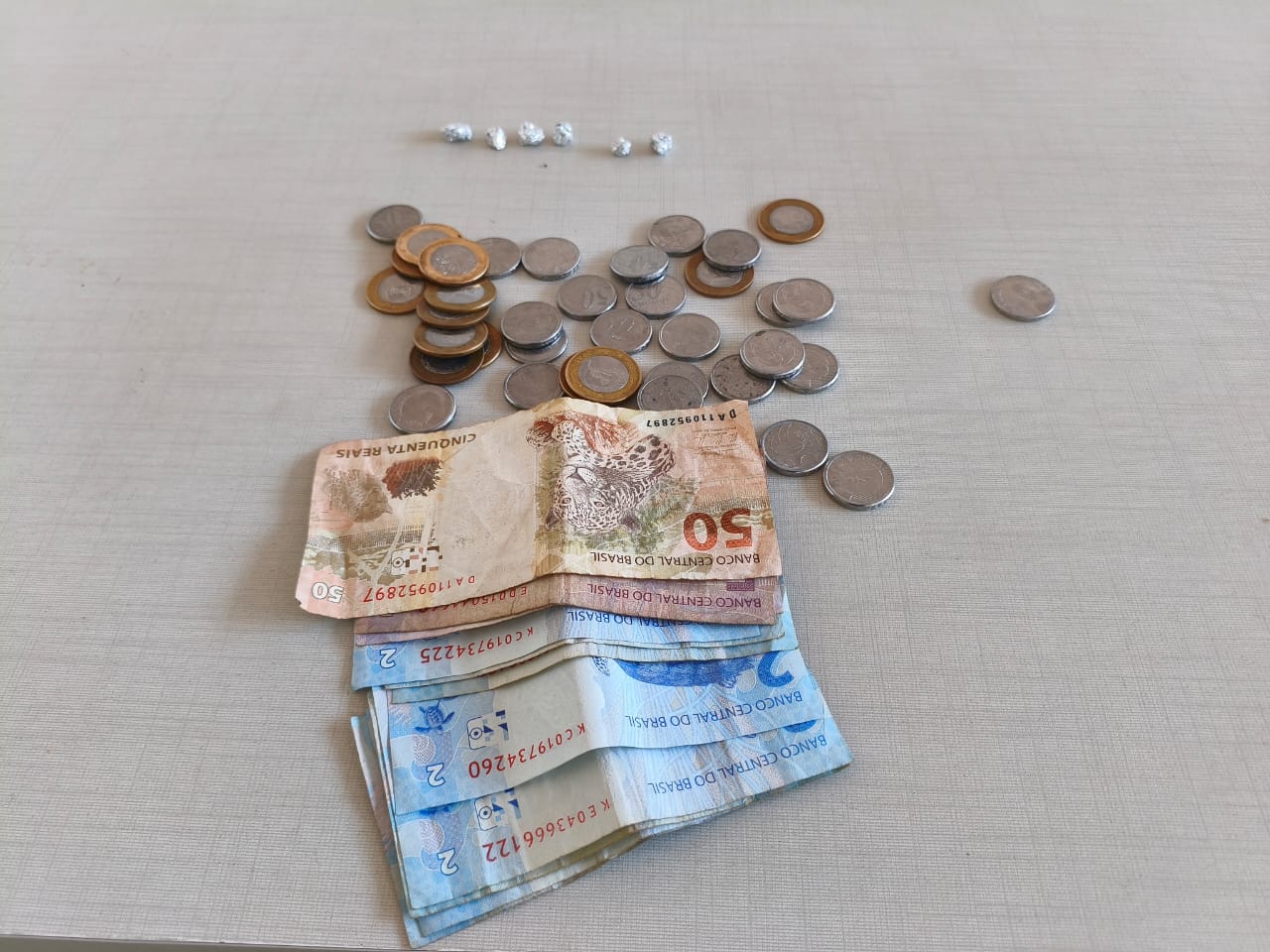 Durante a revista pessoal, foram encontrados R$ 81,00 em notas diversas e três invólucros de papel alumínio contendo substância análoga ao crack. Questionado sobre o restante do dinheiro, o homem afirmou ter usado parte do valor para comprar drogas, consumindo algumas pedras e guardando outras em casa.