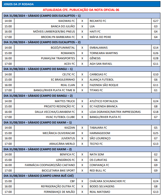 Confira na imagem abaixo os confrontos de abertura da 2ª da Categoria Livre da Taça Mauro Maiorki de Futebol Suíço de 2024
