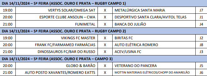 Na Categoria Veterano as partidas dessa fase serão realizadas na noite desta quinta-feira (14). Os jogos estão agendados para três campos, todos na Associação Ouro e Prata, na Vila Industrial, entre às 19h00 e às 21h00.