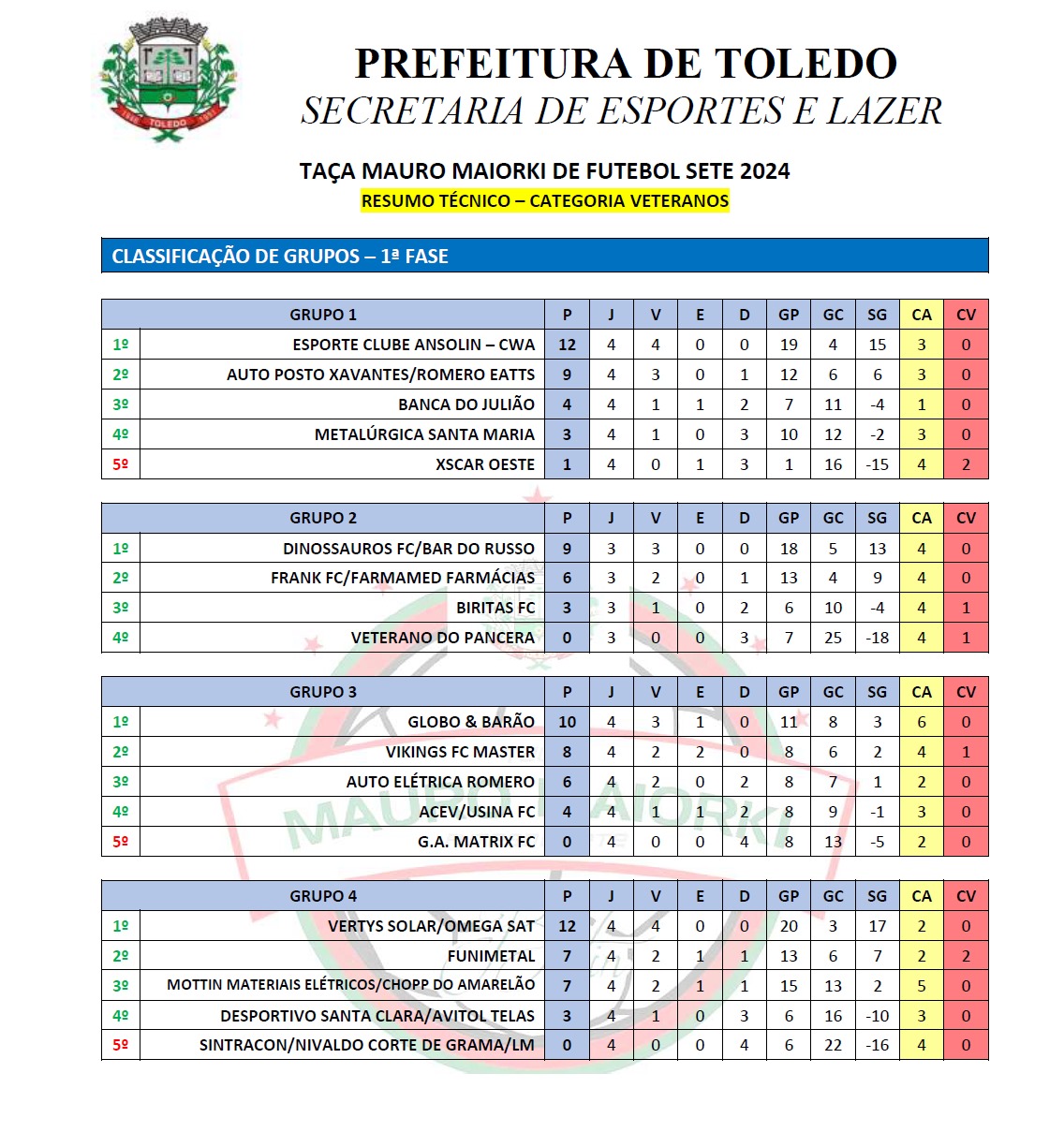 A classificação final da primeira fase ficou assim: no grupo 1, Esporte Clube Ansolin liderou com 12 pontos, seguido por Auto Posto Xavantes/Romero com 9 pontos; no grupo 2, Dinossauros FC/Bar do Russo ficou em primeiro com 9 pontos, seguido pelo Frank FC/FARMAMED com 6 pontos; no grupo 3, Globo & Barão terminou na liderança com 10 pontos, seguido por Vikings FC Master com 8 pontos; e no grupo 4, Vertys Solar/Omega SAT liderou com 12 pontos, seguido pela Funimetal com 7 pontos. Os quatro primeiros colocados de cada grupo avançam para a próxima fase.