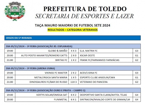 Na última terça-feira, 5 de novembro, a Taça Mauro Maiorki, categoria Veterano, realizou os jogos da 5ª rodada, que definiram os times classificados para a fase de mata-mata. As partidas foram realizadas em três campos: Associação Jardim Esplanada, Arena Usina e Associação Ouro e Prata, com destaque para confrontos acirrados que agitaram a competição.