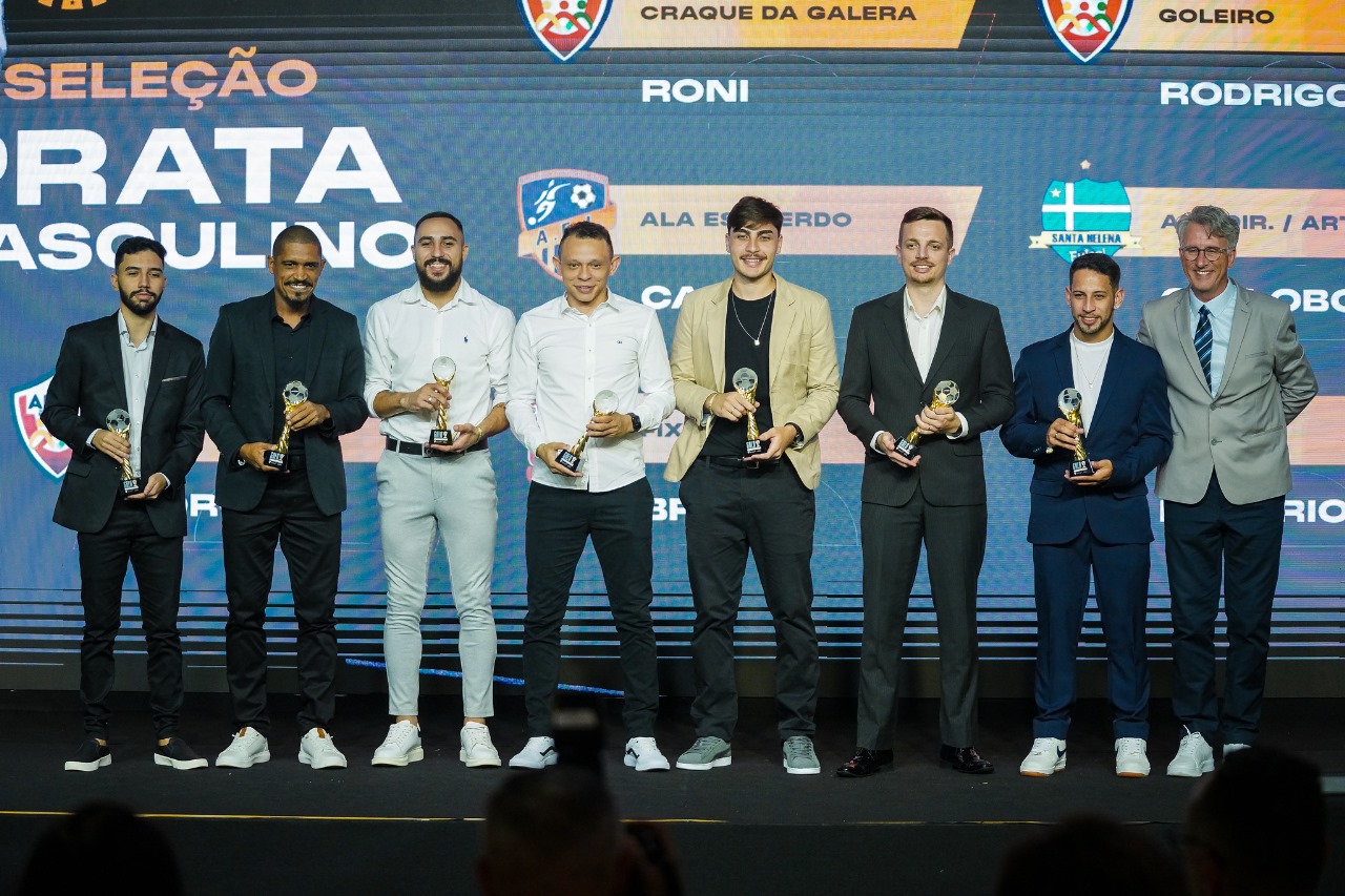 Técnico Luciano Bonfim e fixo Bruno Kosloski, do Esporte Futuro, são premiados na Gala Futsal Paraná 2024