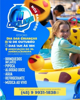 O Dia das Crianças está chegando e o To Circulando realizará na cidade de Toledo uma celebração especial. A 1ª edição do "To Circulando Nos Bairros" promete encantar crianças e suas famílias com uma série de atividades temáticas, que ocorrerão no próximo dia 12 de outubro, das 14h00 às 18h00. O local escolhido para a festa é a Associação de Moradores do Jardim Europa/América, situada na Rua Carlos Drumond de Andrade, no Jardim Europa, ao lado do Centro de Referência de Assistência Social (CRAS).