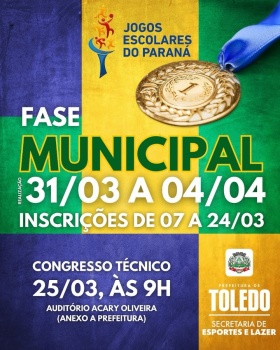 A Fase Municipal dos Jogos Escolares do Paraná (JEPS) já está com as inscrições abertas em Toledo. A competição será realizada entre os dias 31 de março e 04 de abril de 2025, reunindo estudantes de diversas instituições de ensino do município em 13 modalidades esportivas.