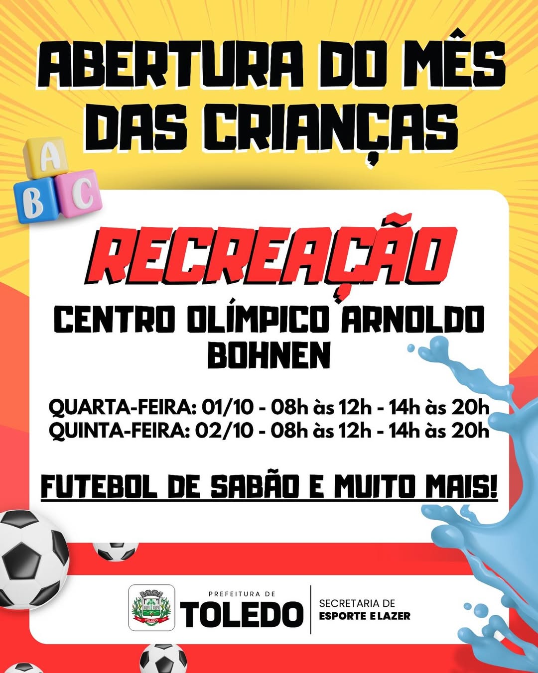 A Prefeitura de Toledo, por meio da Secretaria Municipal de Esportes e Lazer (Smel), realiza a abertura oficial do Mês das Crianças com dois dias de recreação no Centro Olímpico Arnoldo Bohnen. As atividades serão realizadas na quarta-feira, dia 01º de outubro, e na quinta-feira, 02 de outubro, sempre nos períodos da manhã, das 08h00 às 12h00, e da tarde à noite, das 14h00 às 20h00.