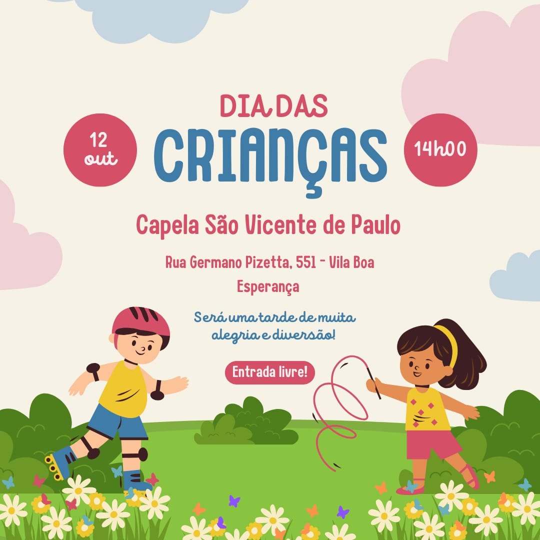 A Capela São Vicente de Paulo, localizada na Vila Boa Esperança, promoverá uma festa em homenagem ao Dia das Crianças, a partir das 14h00, no salão da igreja, localizado na Rua Germano Pizetta, Nº 551. O evento contará com uma série de brinquedos, como cama elástica e tobogã, além de atividades recreativas como pintura facial. Os participantes também poderão desfrutar de diversas opções de comes e bebes ao longo da tarde.