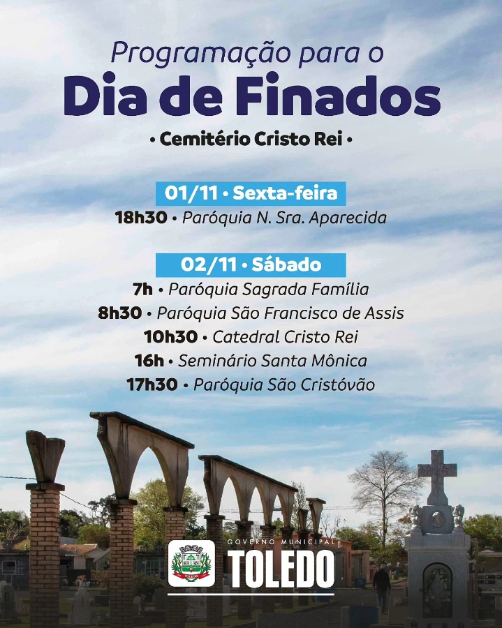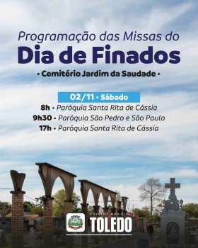 A cidade de Toledo já definiu a programação completa das missas de Finados e as orientações para os visitantes que prestarão homenagens aos entes queridos no próximo dia 02 de novembro. As celebrações serão distribuídas nos cemitérios Cristo Rei e Jardim da Saudade, além de outros locais na região, com o intuito de atender a todos que desejam participar das missas nesse dia de respeito e recordação.
