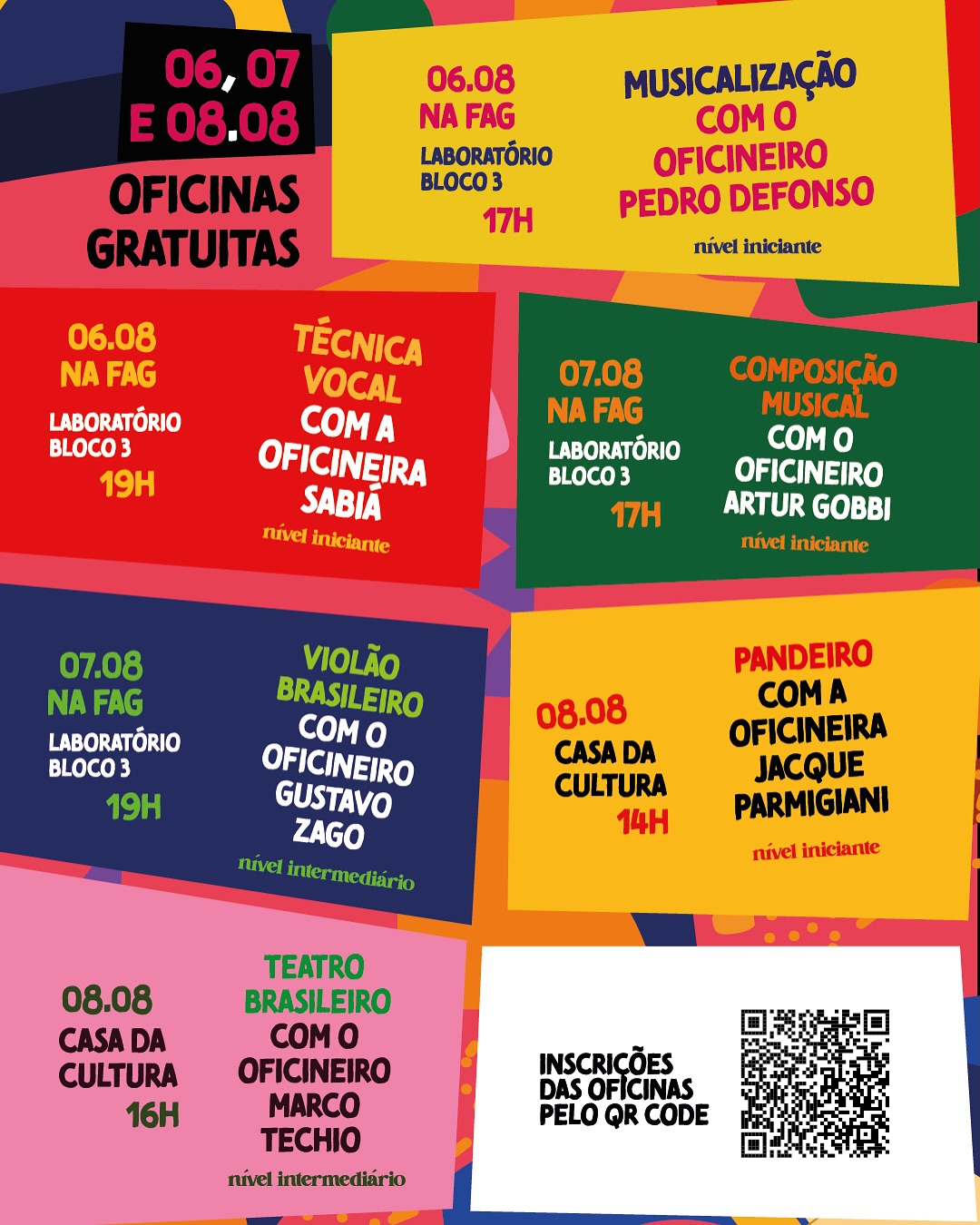 Nos dias 06, 07 e 08 de agosto, o público poderá participar de oficinas com foco na prática artística e na criação coletiva, conduzidas por artistas e educadores convidados. As atividades serão realizadas no Centro Universitário FAG e na Casa da Cultura, com vagas limitadas.