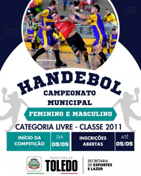 Pela primeira vez, Toledo terá uma competição exclusiva de handebol em nível municipal. A 1ª edição do Campeonato Municipal de Handebol terá início no dia 09 de maio, com disputas nos naipes Feminino e Masculino Livre, classe 2011 (atletas com 15 anos ou mais).
