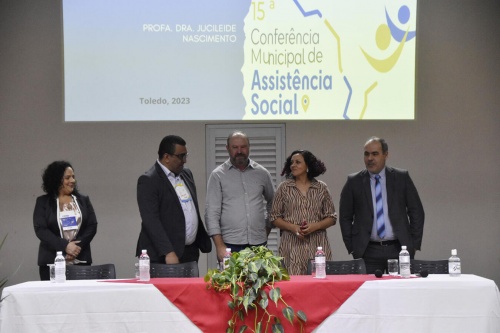 Autoridades do Executivo, do Legislativo e do Ministério Público prestigiaram a solenidade de abertura da 15ª Conferência Municipal de Assistência Social de Toledo. Entre elas, compuseram a mesa de honra o vice-prefeito Ademar Dorfschmidt, que representou o prefeito Beto Lunitti; o vereador Professor Oséias; o promotor responsável pela 2ª Promotoria de Justiça da Comarca de Toledo, José Roberto Moreira; a secretária de Assistência Social, Solange Silva dos Santos Fidelis; e a presidente do Conselho Municipal de Assistência Social (CMAS), Edmara de Souza.
