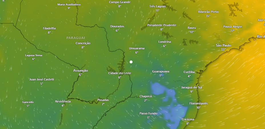 Além de Toledo, outras cidades próximas também enfrentaram frio intenso. Cascavel marcou -2,4°C, Francisco Beltrão teve -0,3°C e Foz do Iguaçu chegou a -0,2°C. Palmas registrou -2,9°C, enquanto no distrito de Horizonte, também em Palmas, a mínima foi de -4,6°C.