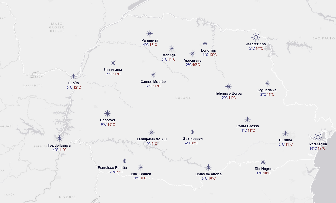 A forte massa de ar polar que avança sobre o Brasil provocou temperaturas negativas em várias regiões do Paraná, principalmente no Oeste, Sudoeste e Centro-Sul. O fenômeno é resultado de uma frente fria que segue em direção ao Sudeste e aos demais estados do Centro-Oeste.