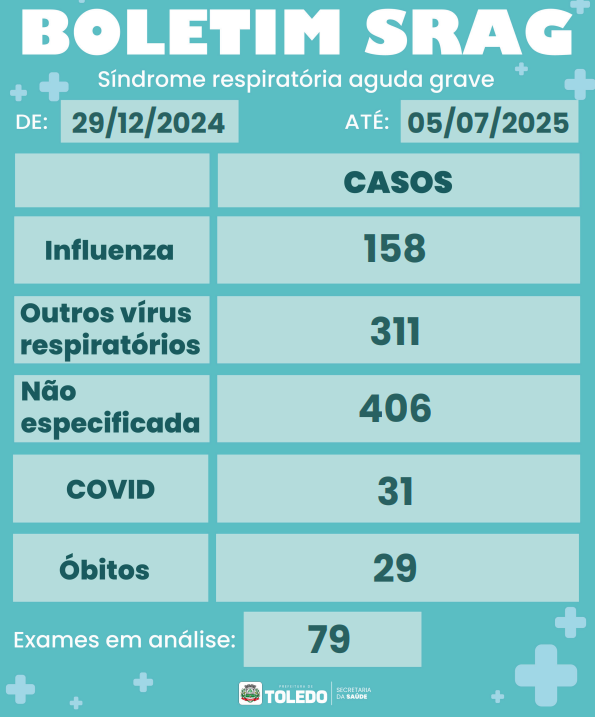 A Secretaria de Saúde de Toledo confirmou 29 mortes por Síndrome Respiratória Aguda Grave (SRAG) desde o início de 2025. Apenas no mês de junho, foram seis óbitos registrados no município. A maioria das vítimas era composta por homens com mais de 60 anos de idade que não estavam vacinados contra a gripe, segundo informou o diretor de Vigilância em Saúde, Joel José Palma Junior.