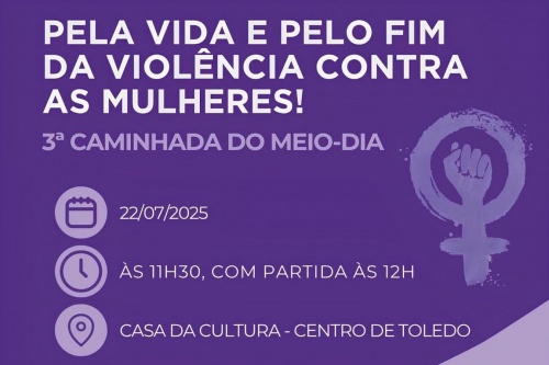 Na próxima terça-feira (22), Toledo engrossa o coro de mais de uma centena de municípios paranaenses que irão às ruas, simultaneamente, para denunciar e combater uma das formas mais brutais de violência de gênero: o feminicídio. Às 11h30, na Praça da Cultura, será iniciada a concentração da 3ª Caminhada do Meio-Dia, uma mobilização pública que convida a sociedade a se unir em memória das mulheres que perderam as suas vidas por esse crime e na defesa de políticas que enfrentem a violência de forma estrutural.